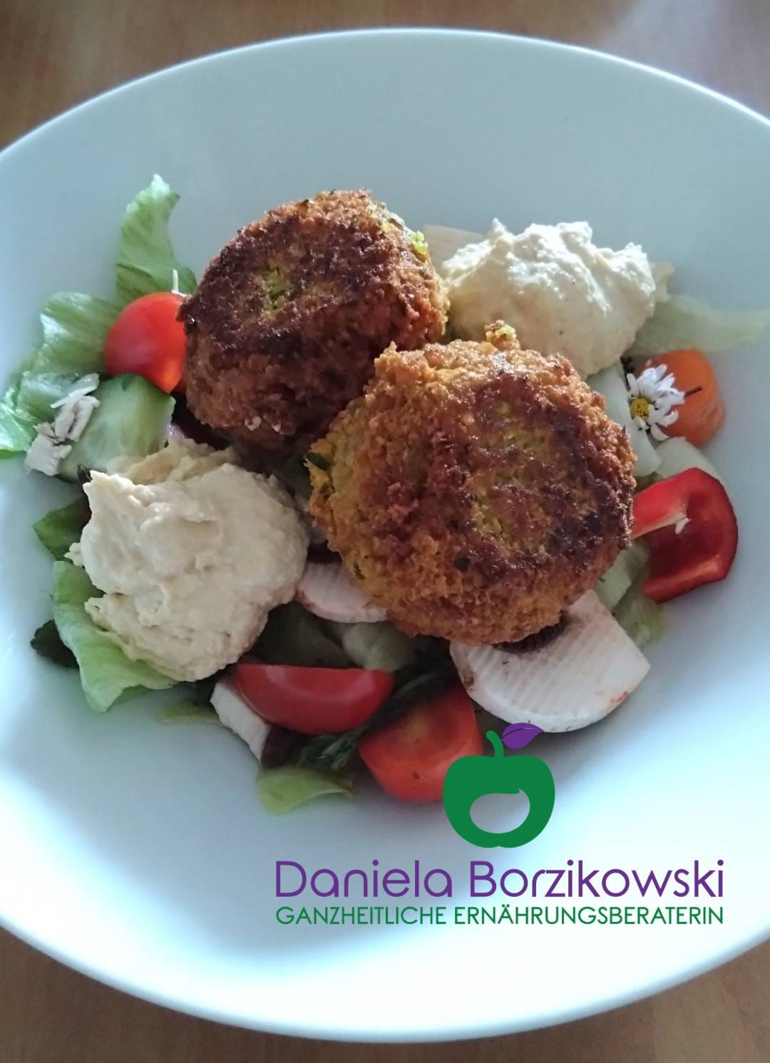 Falafel bestehen zum größten Teil aus Kichererbsen. Kichererbsen sind sehr reich an Eiweiß und an Ballaststoffen.  Das Verhältnis von Fett, Eiweiß und Kohlenhydraten ist ausgewogen. Aber in den Hülsenfrüchten steckt noch viel mehr. Mineralstoffe, Spurenelemente und Ballaststoffe sind enthalten. Besonders wertvoll ist der relativ hohe Anteil an B-Vitaminen.
