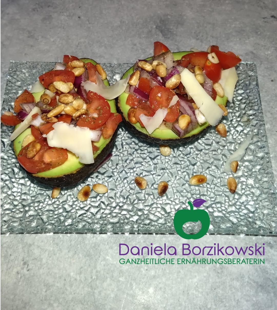 Die Tomatenwürfel mit der fein gehackten Zwiebel in die Mulde der Avocadohälften geben und mit Pinienkernen und Parmesan bestreuen.