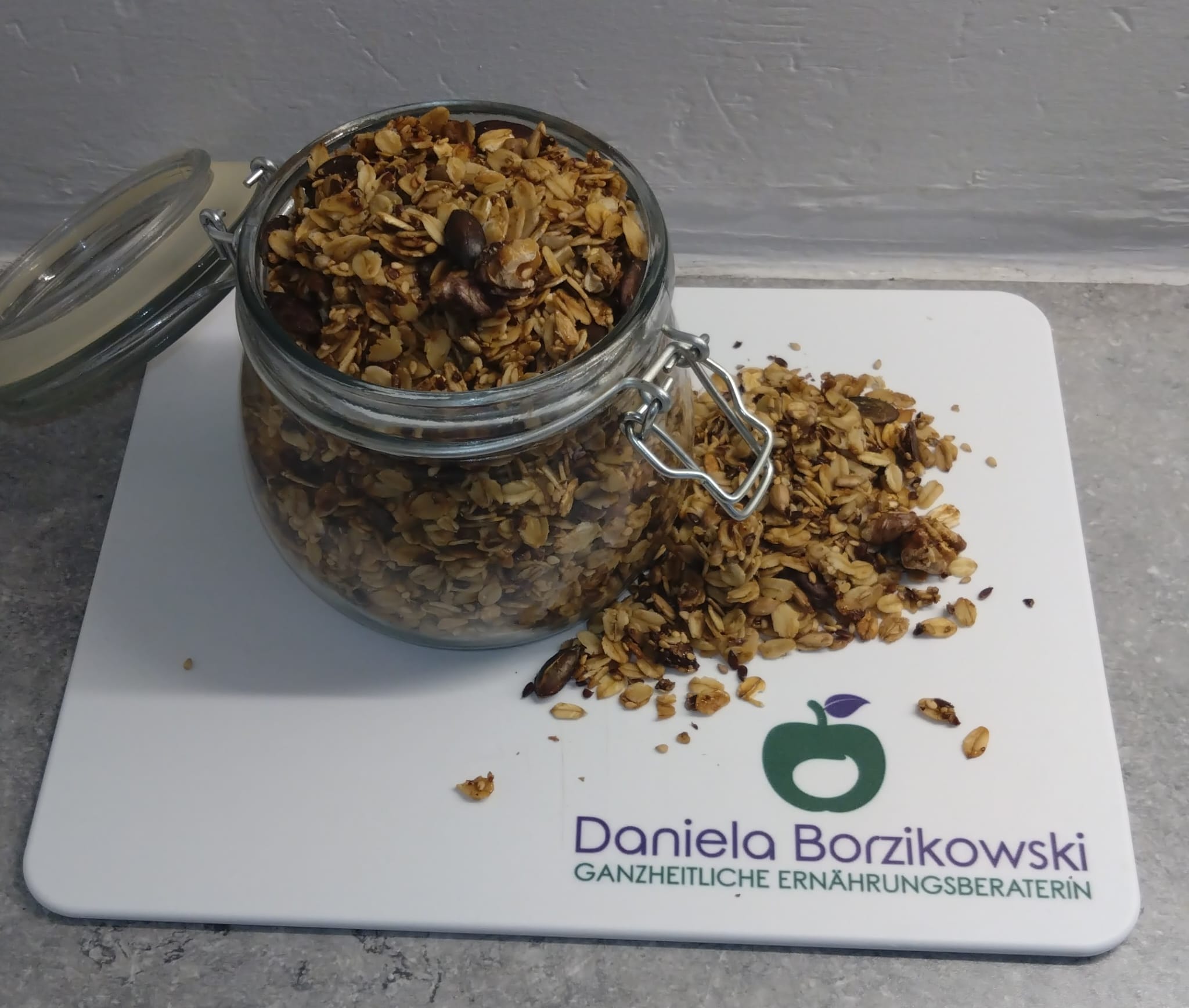 Einige Zutaten können auch gerne ausgetauscht werden. Es können andere Nüsse (z.B. Hasel- oder Pecannüsse) oder andere Zutaten wie Amarant oder Quinoa verwendet werden. Auch Gewürze wie Zimt, Vanille oder echter Kakao können dem Müsli zugegeben werden.